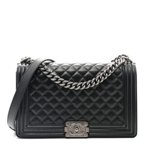 Size Base length: 11 in Height: 6.75 in Width: 3 in Drop: 11 in Drop: 19.5 in This is an CHANEL Caviar Quilted New Medium Boy Flap in Black. This stylish shoulder bag is crafted ...