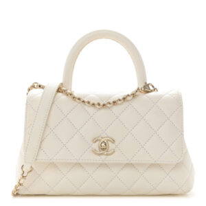 Size Base length: 9 in Height: 5.5 in Width: 3.5 in Drop: 3 in Drop: 18.5 in This is an CHANEL Caviar Quilted Mini Coco Handle Flap in White. This tote is crafted of diamond-stitched ...