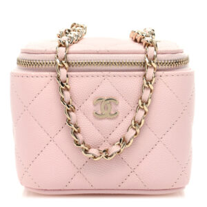 This is an CHANEL Caviar Quilted Mini Vanity Case With Chain in Pink. This stylish crossbody is crafted of luxurious caviar leather in light pink. The bag features a ...