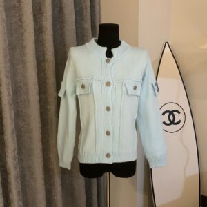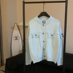 Chanel Chanel Double C Embroidery Custom Button Baby Blue Stand Collar Long Sleeve Button Knitted Sweater Cardigan Jacket