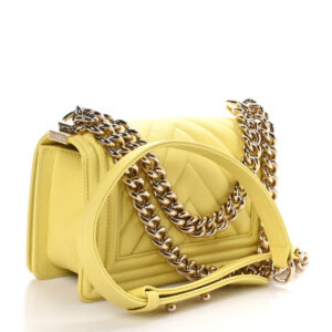 Size Length: 7.75 in Height: 4.5 in Width: 2.75 in Drop: 12 in Drop: 22 in This is an CHANEL Caviar Chevron Quilted Small Boy Flap in Yellow. This chic shoulder bag is crafted of ...