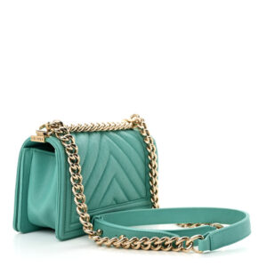 Size Base length: 8 in Height: 4.75 in Width: 2.75 in Drop: 12 in Drop: 21.25 in This is an CHANEL Caviar Chevron Quilted Small Boy Flap in Green. This chic shoulder bag is crafted ...