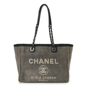 CHANEL Canvas Small Deauville Tote in Grey. This tote is crafted of grey canvas, with a white Chanel advertisement logo on the front. The bag features silver chain-link fabric ...