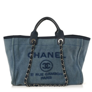 CHANEL Canvas Sequin Medium Deauville Tote in Navy. This stylish tote is crafted of fine denim blue canvas with a blue sequined Chanel 31 Rue Cambon Paris logo. The ...