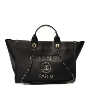 CHANEL Caviar Large Studded Deauville Tote in Black. This stylish handbag is crafted of grained caviar leather in black with a gold studded Chanel advertisement logo. It features black ...