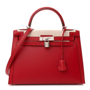 HERMES Berline Toile Swift Kelly Sellier 32 Rouge Piment Ecru
