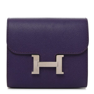 Size Base length: 5 in Height: 4.5 in Width: 1 in Description This is an HERMES Epsom Constance Short Wallet in Iris. This compact essential wallet is crafted of fine stamped leather in purple ...