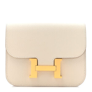 Size Base length: 5 in Height: 4 in Width: 0.75 in Description This is an HERMES Epsom Constance Slim Wallet Craie. This compact essential wallet is crafted of Epsom calfskin leather in ivory and ...