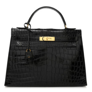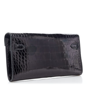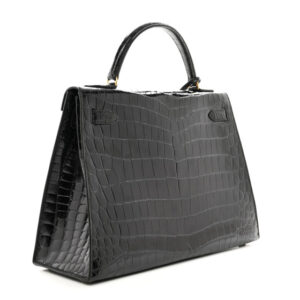 Size Base length: 12.75 in Height: 9.00 in Width: 4.75 in Drop: 3.25 in Description This is an HERMES Shiny Niloticus Crocodile Kelly Sellier 32 in Black. This vintage Kelly bag is crafted of glossy ...