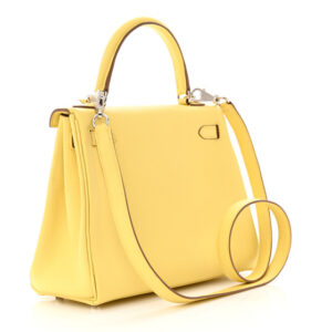 Size Base length: 9.25 in Height: 7 in Width: 4 in Drop: 3.25 in Drop: 18.5 in Description This is an authentic HERMES Togo Kelly Retourne 25 in Jaune Poussin. This chic Kelly bag is crafted ...