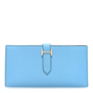 Size Base length: 6.75 in Height: 3.75 in Width: 0.75 in Description This is an HERMES Epsom Bearn Gusset Wallet in Bleu Celeste. This chic wallet is crafted of richly textured epsom calfskin leather ...