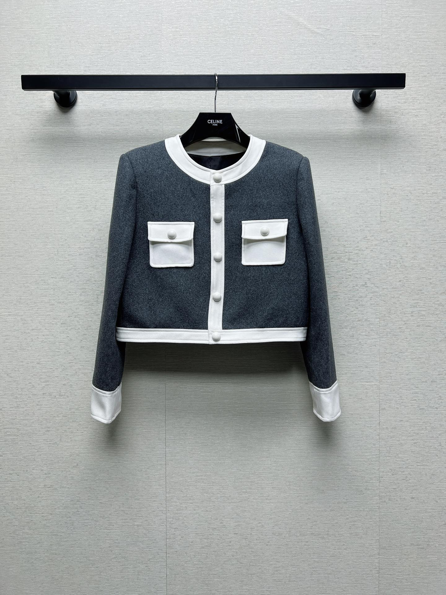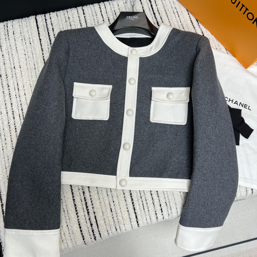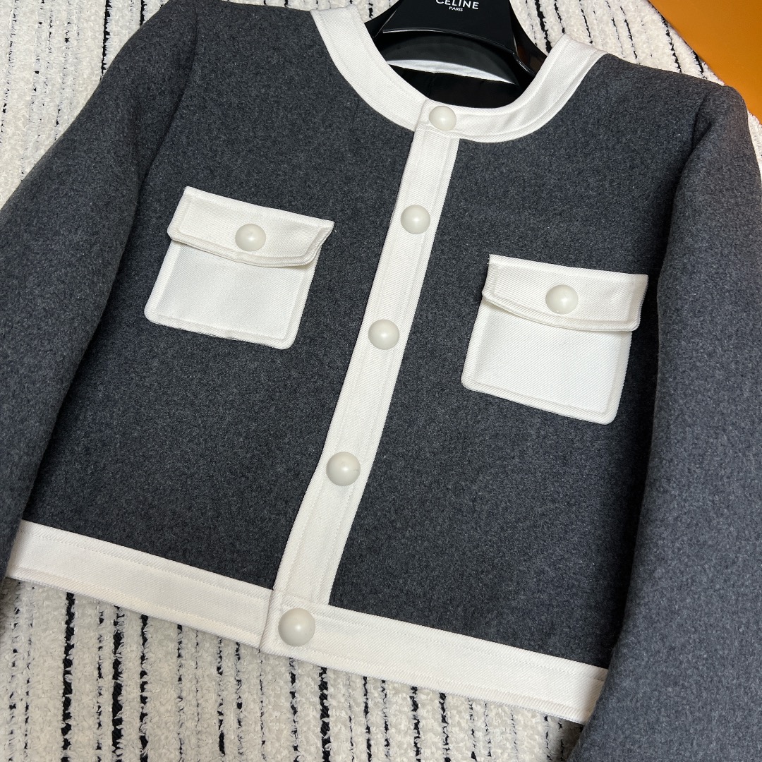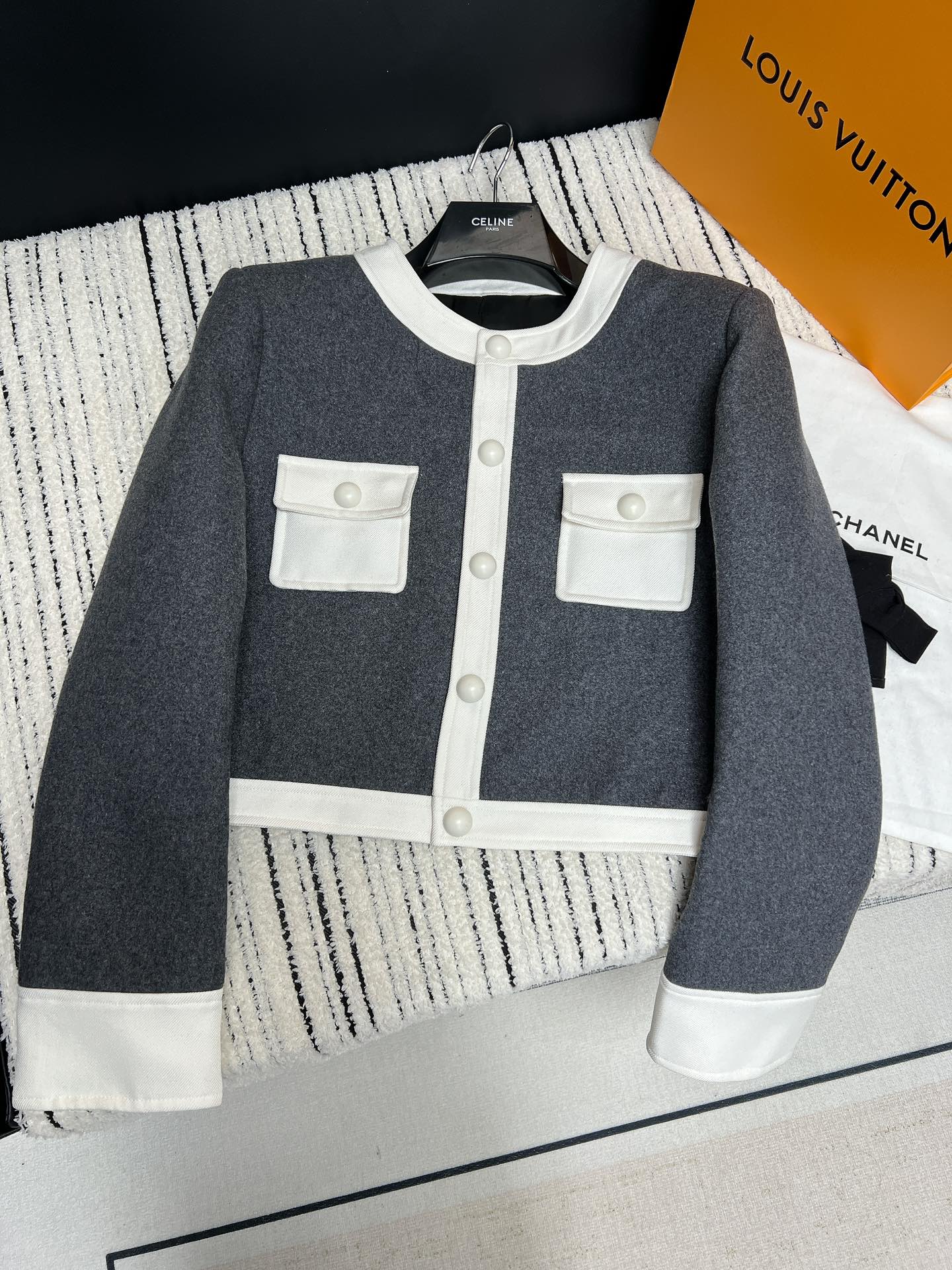 Be the first to review “𝐂𝐞𝐥𝐢𝐧𝐞 𝟐𝟒~ High-grade grey and white Chanel jacket”