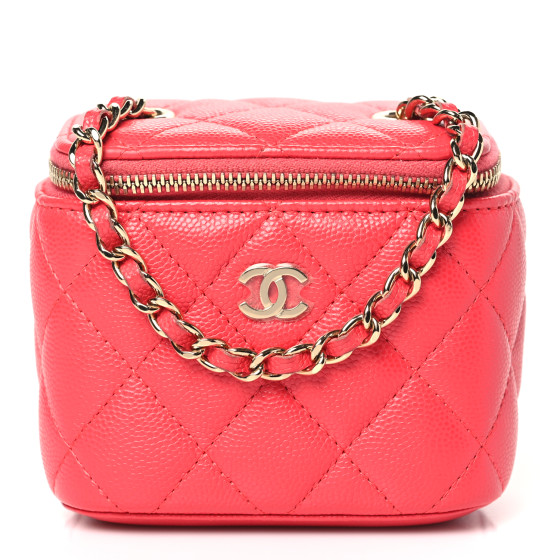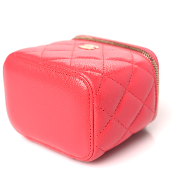 This is an CHANEL Caviar Quilted Mini Vanity Case With Chain in Red. This stylish crossbody is crafted of luxurious caviar leather in red. The bag features a leather threaded light gold chain-link shoulder strap and gold hardware. The handbag features a wrap-around zipper that opens to a matching fabric interior.