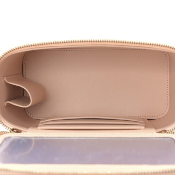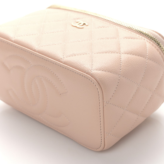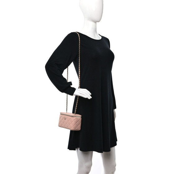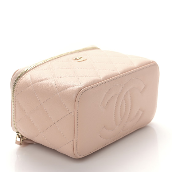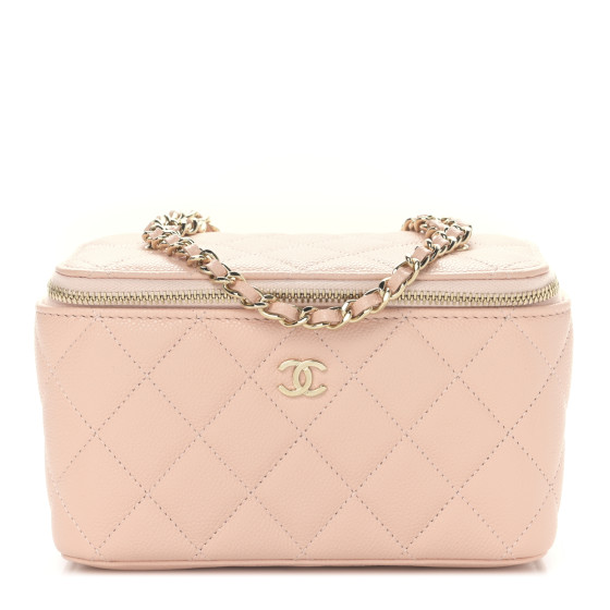 This is an CHANEL Caviar Quilted Small Vanity Case With Chain in Light Beige. This stylish crossbody is crafted of luxurious caviar leather in light beige with a pink hue. The bag features a leather threaded light gold chain-link shoulder strap and gold hardware. The handbag features a 3/4 wrap-around zipper that opens to a matching fabric interior with card slots and a mirror inside the top.