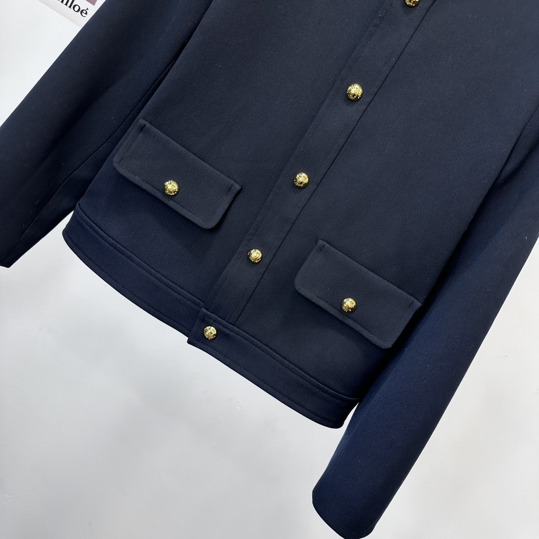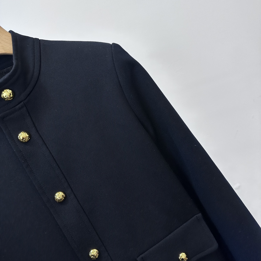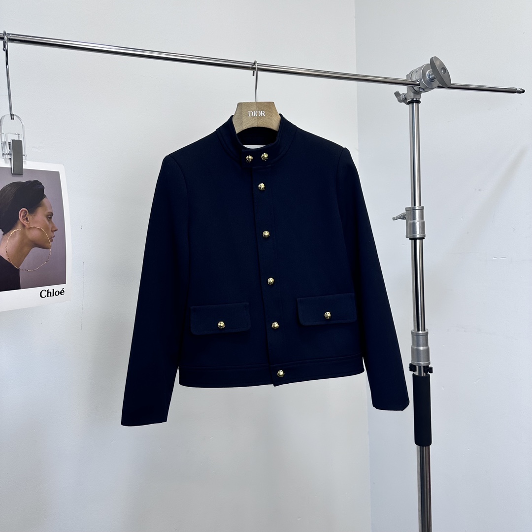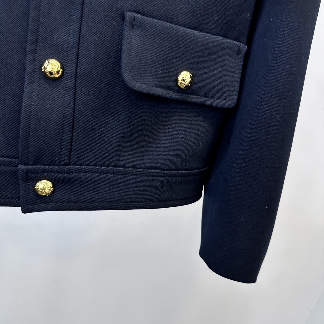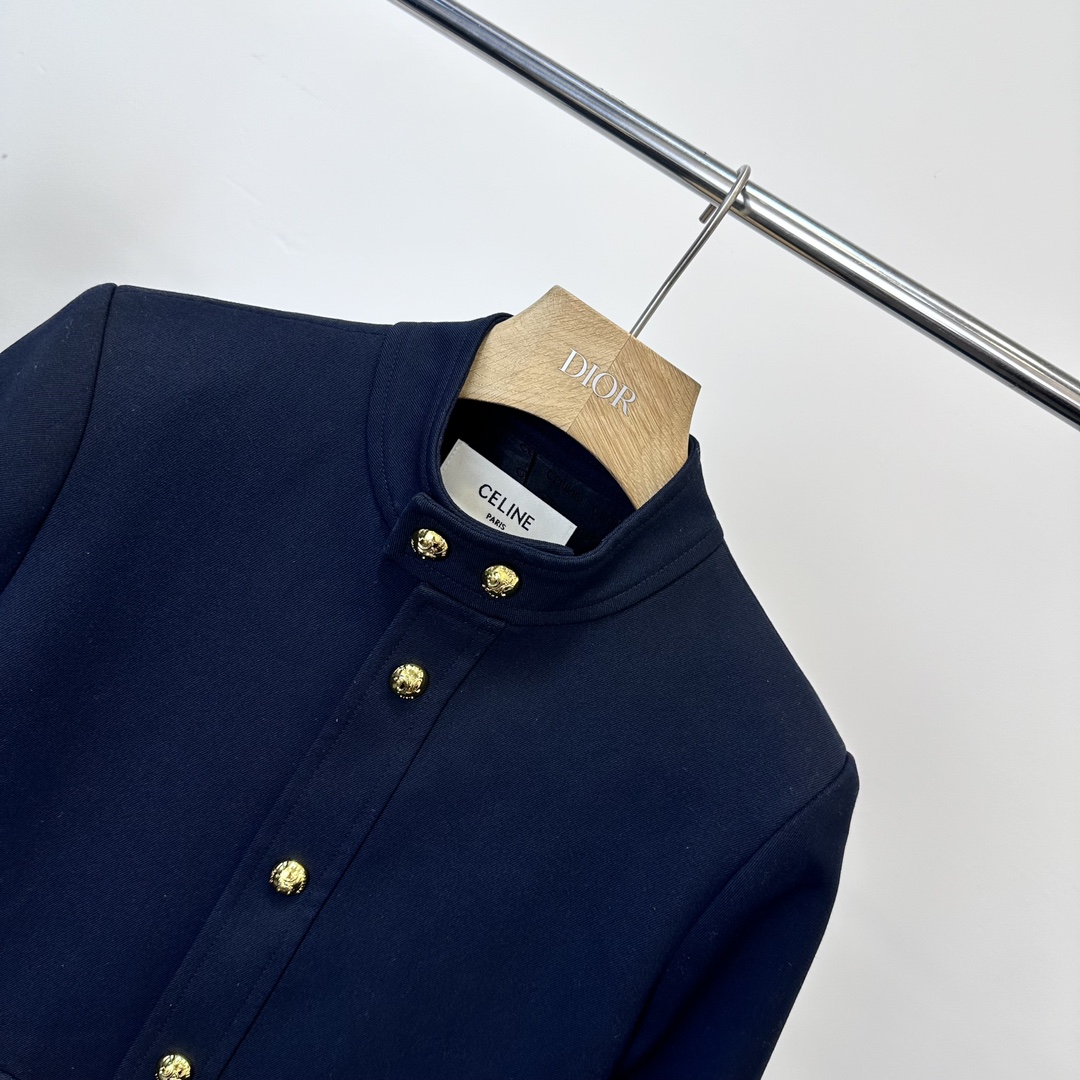 Celine 24 new woolen short coat with stand-up collar and slim fit, customized Arc de Triomphe logo hardware, interprets a new chapter of autumn fashion, classic woolen material, mellow texture, exudes elegance. The round neck design is simple and generous, showing the beautiful neck line, short version, capable and neat, highlighting the body proportion, it has the straightness and handsomeness of a suit, but also the gentleness and elegance of woolen. Whether it is matched with trousers to show the style of a workplace elite, or combined with a skirt to show elegant and intellectual charm, this woolen round neck suit short coat can create a unique fashion look for you. In this autumn, let it become your fashion weapon and shine with confidence.