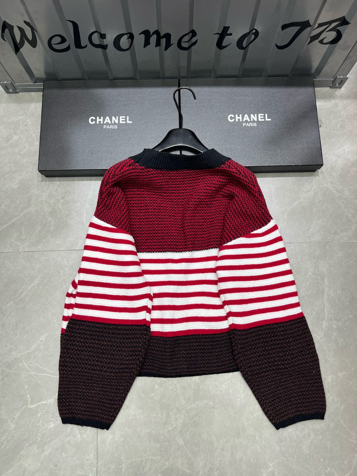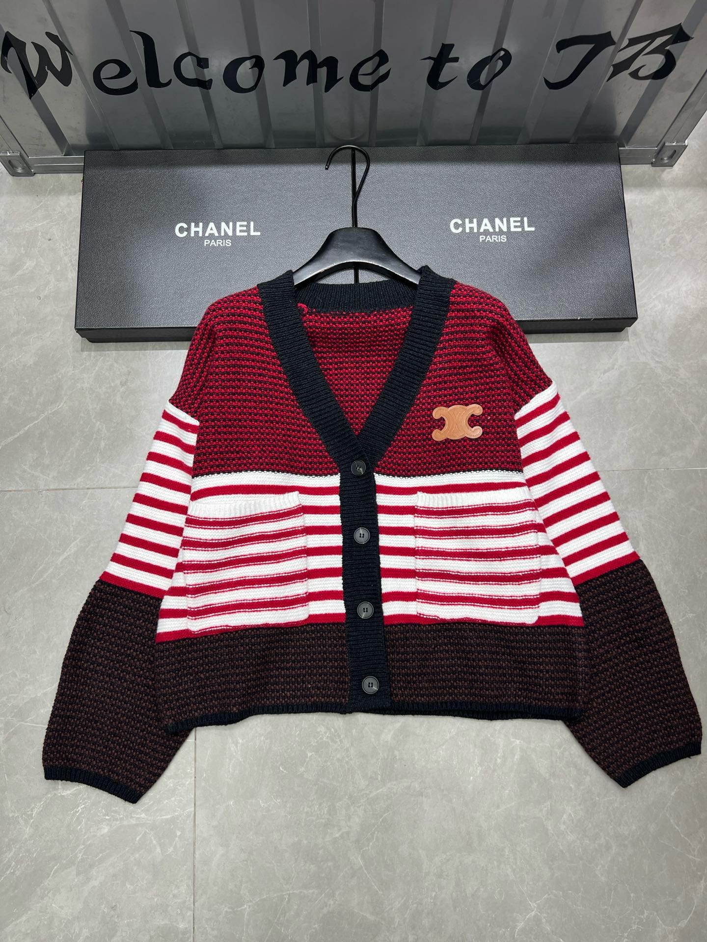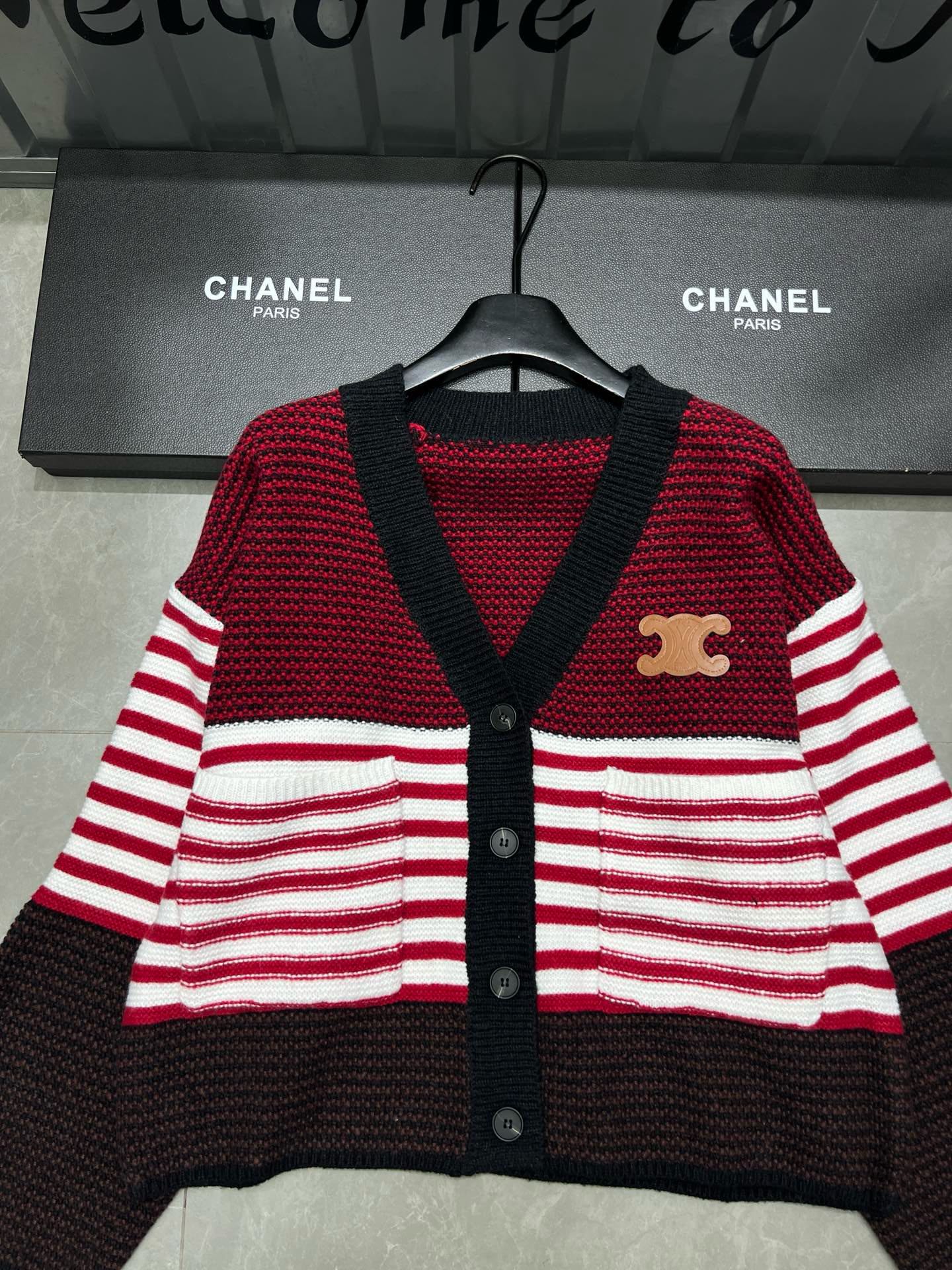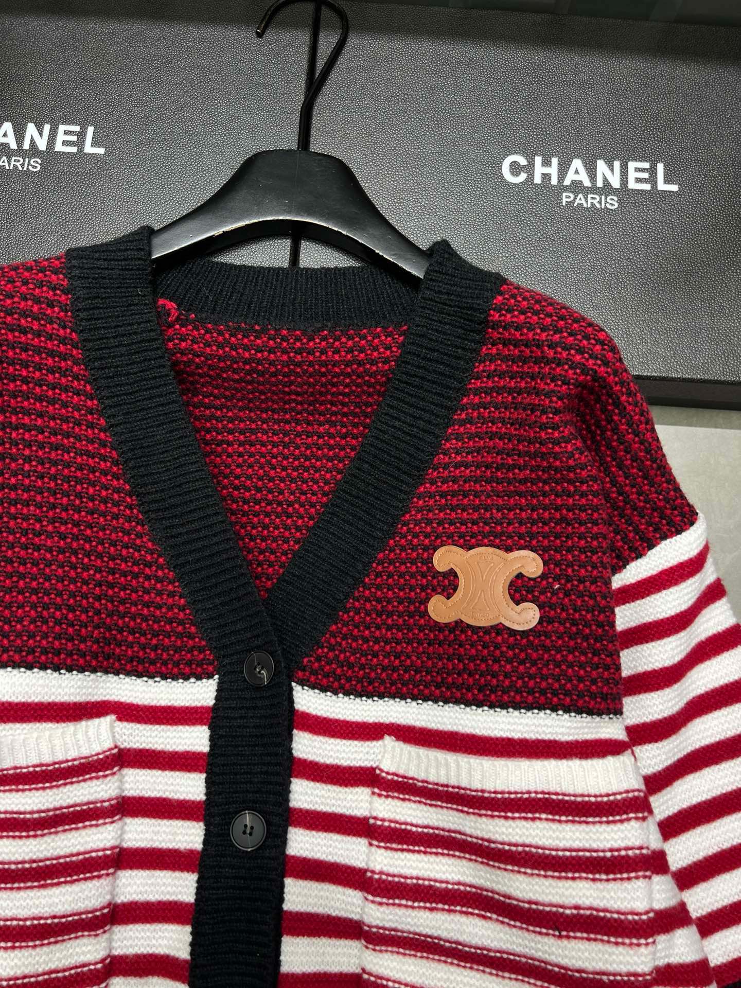 Celine Arc de Triomphe leather label double pocket striped contrast color V-neck long-sleeved button-down knitted sweater cardigan jacket