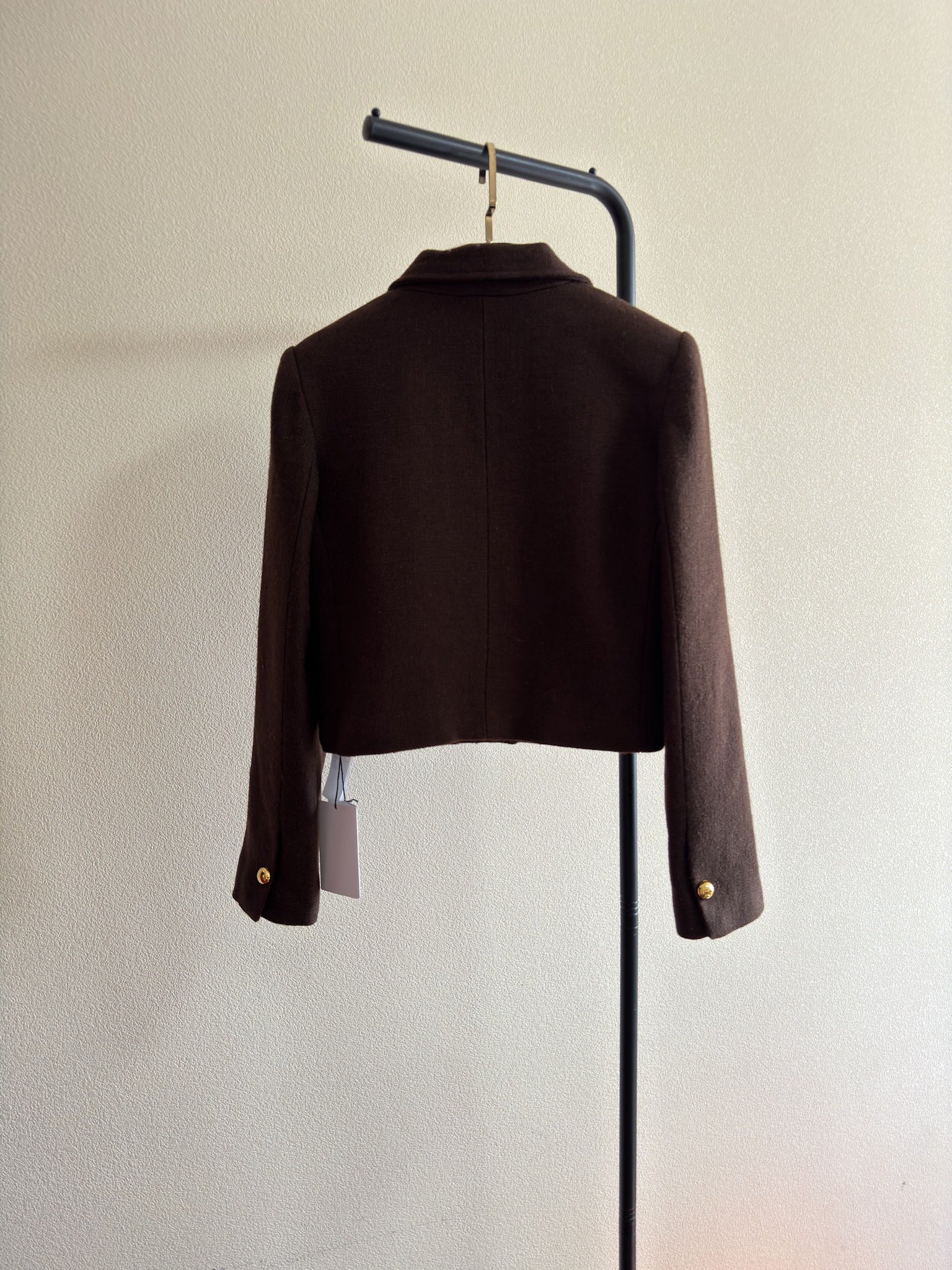 Maillard color, wool blend material, high-grade woolen dark brown, single-breasted lapel, retro gold collar, custom logo glossy buttons, short version, more elongated body lines, unique and stylish upper body, the visual sense of a chaebol daughter