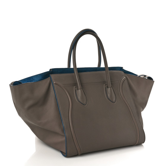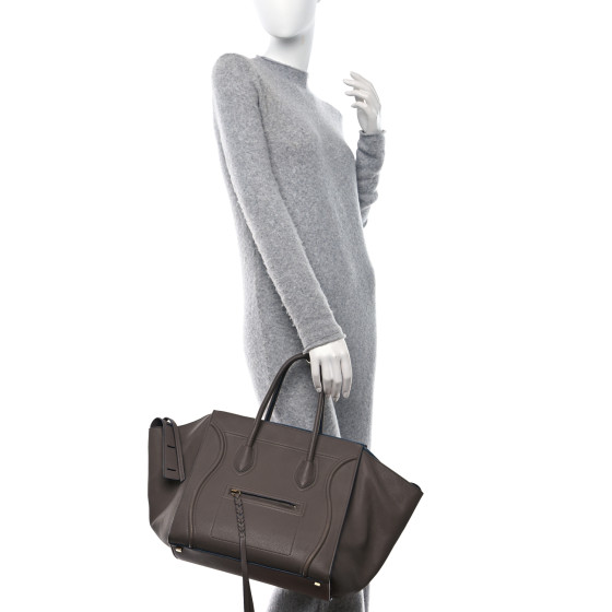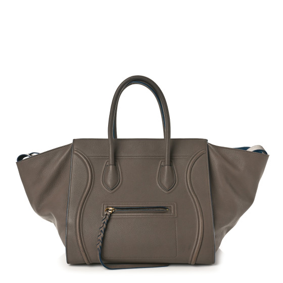 This is an authentic CELINE Baby Grained Calfskin Medium Phantom Luggage in Taupe. This stylish tote is crafted of richly textured calfskin leather in beige. The bag features rolled leather top handles, side extended wings, leather decorative embellishing, a facing zipper pocket, and aged gold hardware. The top is open to a spacious blue suede leather interior with a zipper pocket and can be secured with a strap closure.