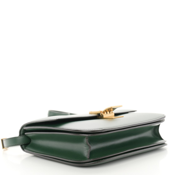 This is an authentic CELINE Box Calfskin Classic Box Medium Flap Bag in Forest. This chic shoulder bag is crafted of smooth calfskin leather in dark green. It features an adjustable leather shoulder strap and a frontal gold press-lock. This opens the flap to a partitioned green leather interior with a zipper compartment and patch pockets.