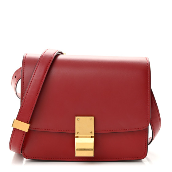 This is an authentic CELINE Box Calfskin Teen Classic Box Flap Bag in Red. This chic shoulder bag is crafted of luxuriously smooth deep red box calfskin leather. The bag features a waist-length shoulder strap and a facing flap with a gold switch-lock. The flap opens to a partitioned leather interior with a zipper pocket.