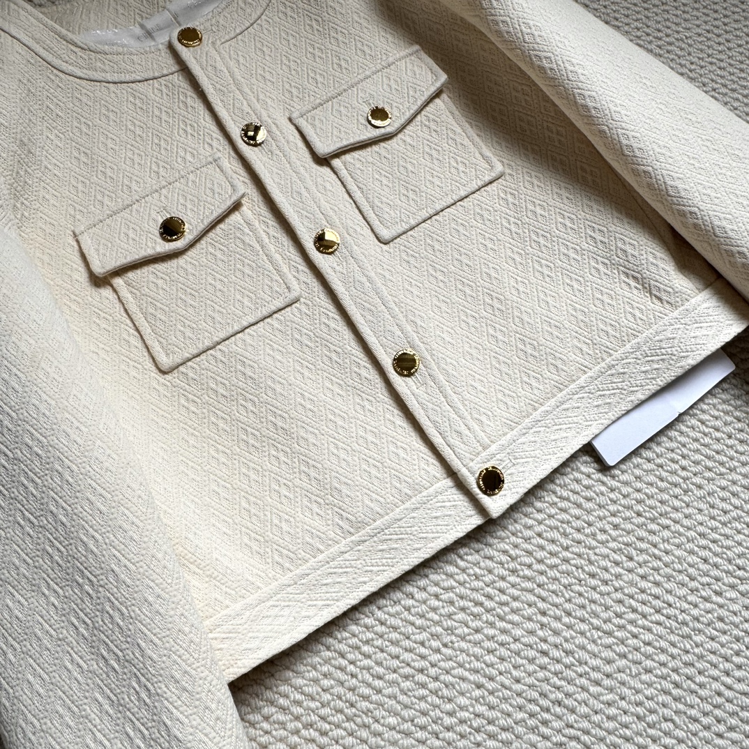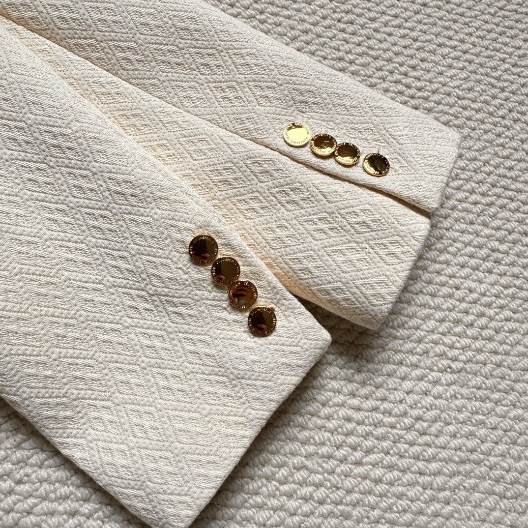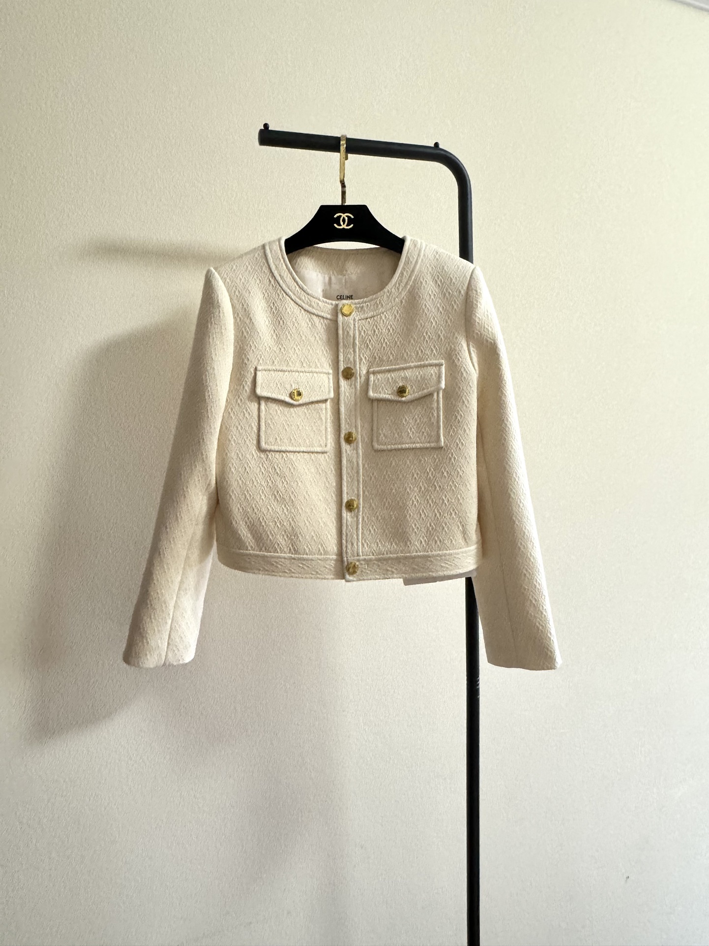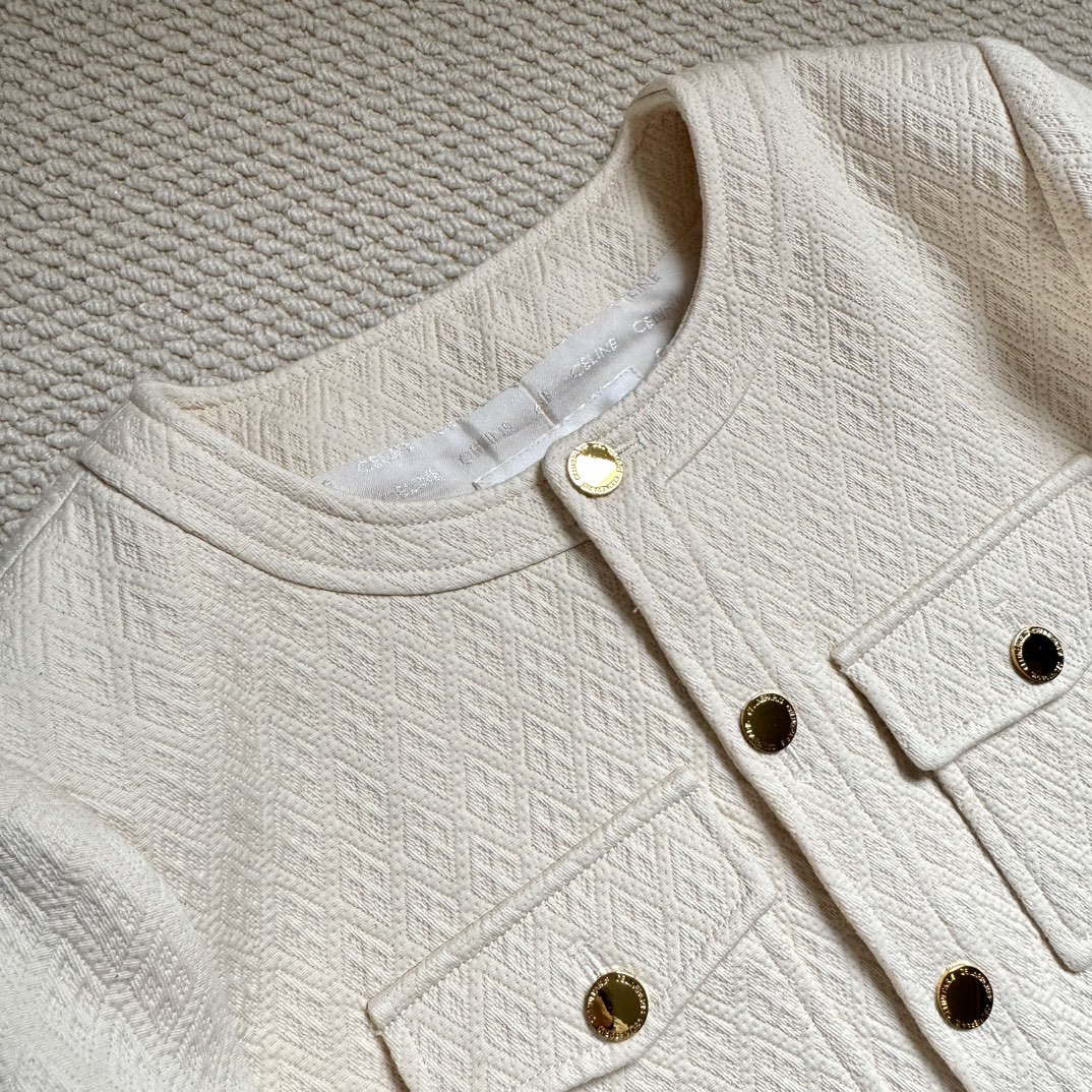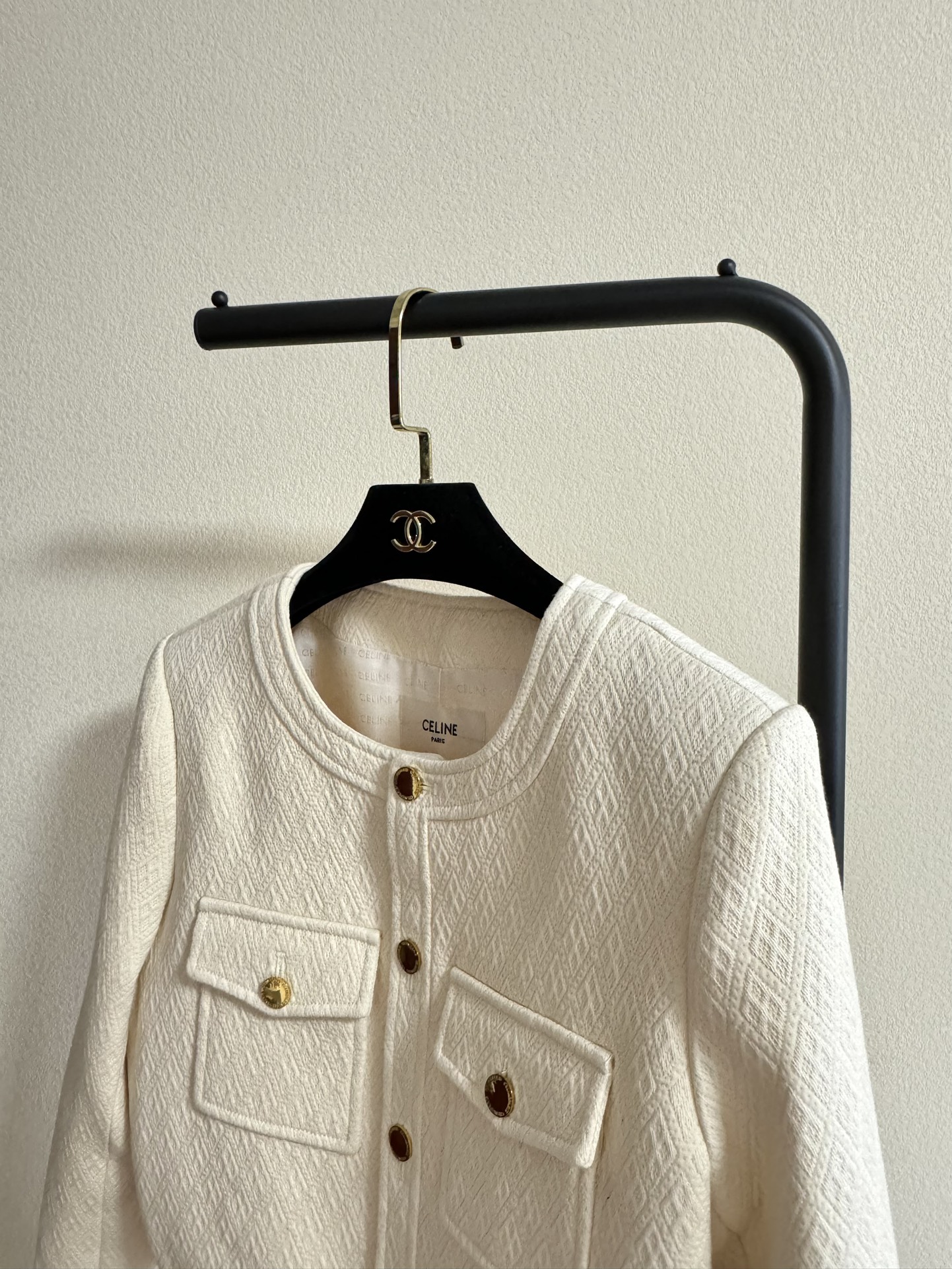 I love it. Creamy color. Classic box shape. Single-breasted design. Simple and elegant. Clean and neat. Custom jacquard fabric inside. Full texture inside and outside. Textured fabric surface. High-end. Paired with retro gold buttons. French elegance. Classic and timeless.