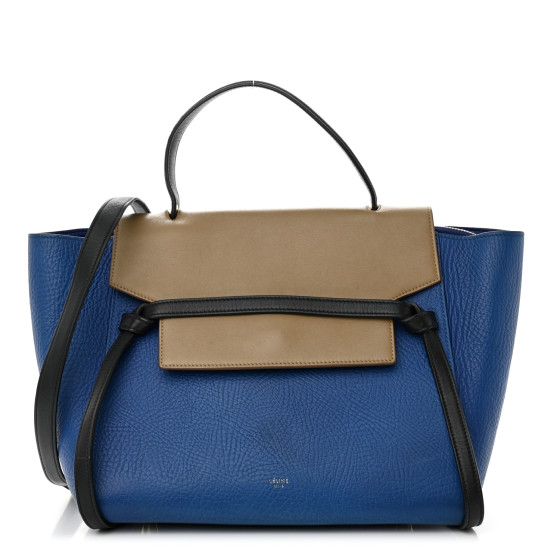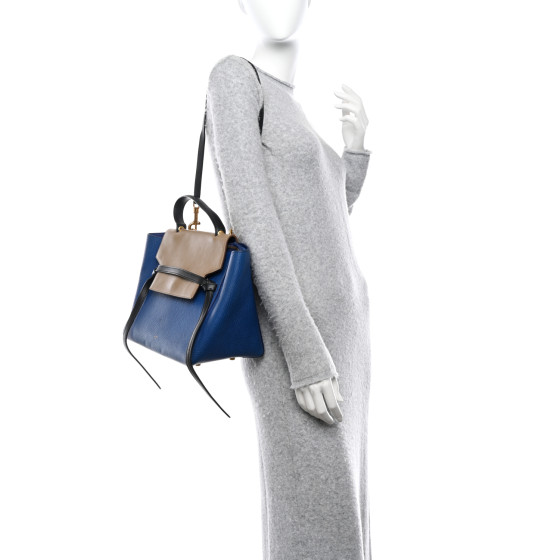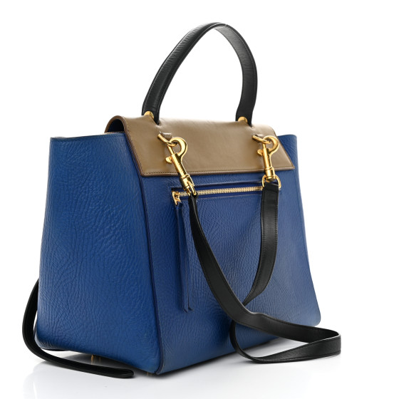 This is an authentic CELINE Elephant Calfskin Mini Tri-Color Belt Bag in Indigo. This chic tote is crafted of rich smooth calfskin leather top with a structured silhouette in blue with smooth leather beige and black accent colors. The bag features a leather strap top handle and an optional shoulder strap with brass clasps. The facing flap opens to a blue leather interior with hanging pockets.