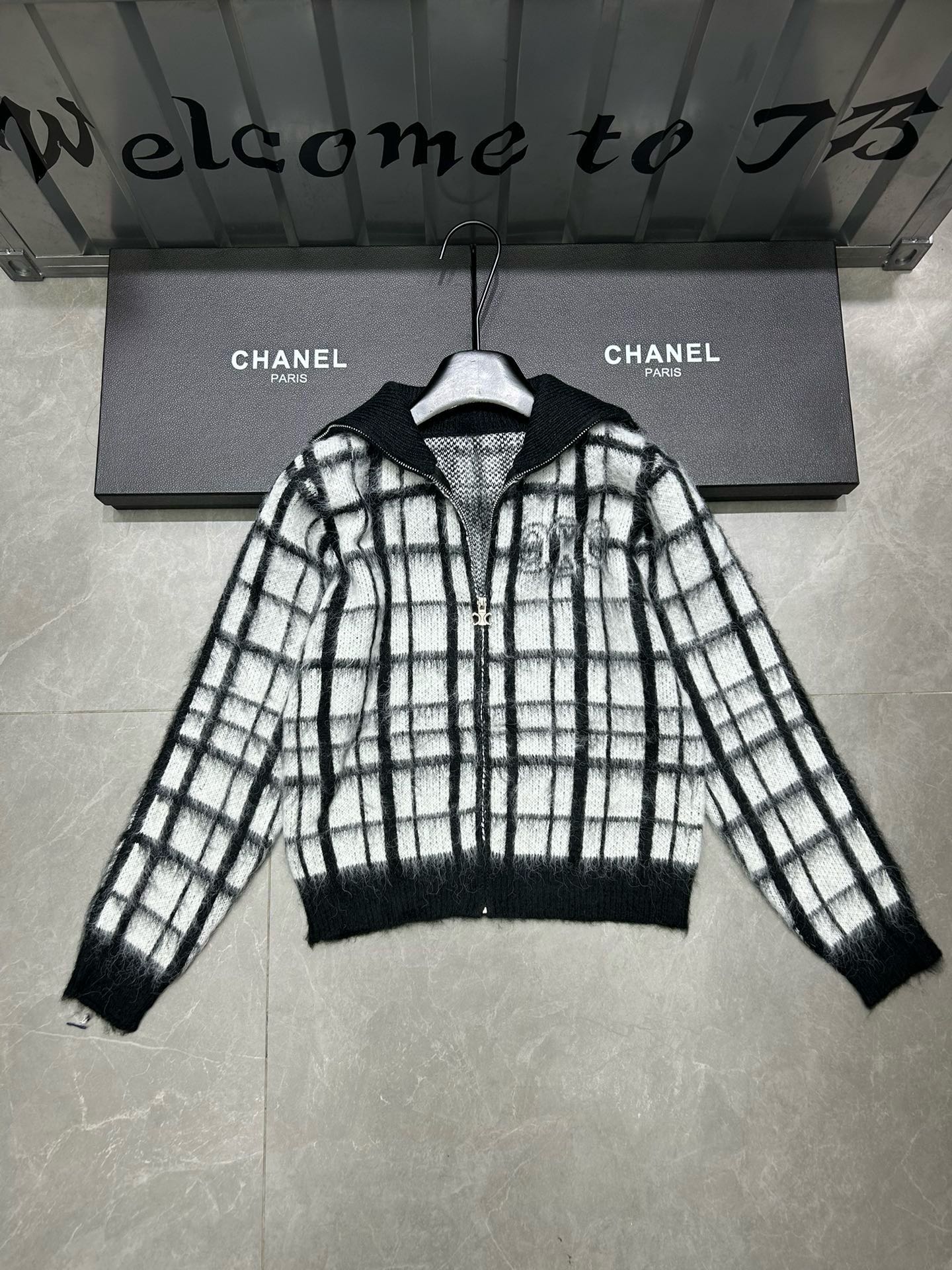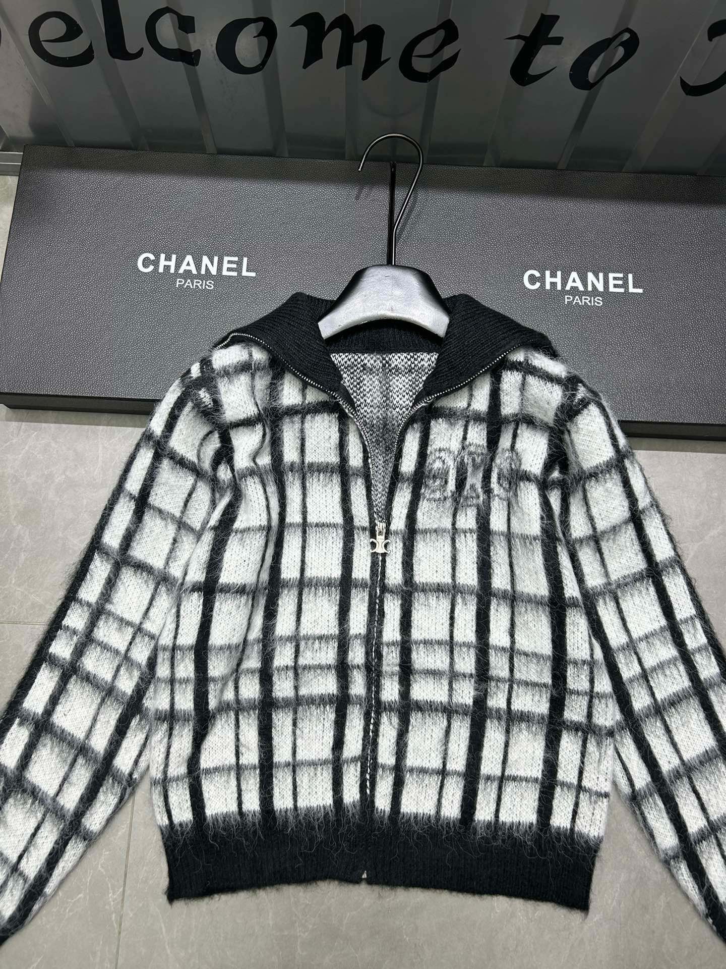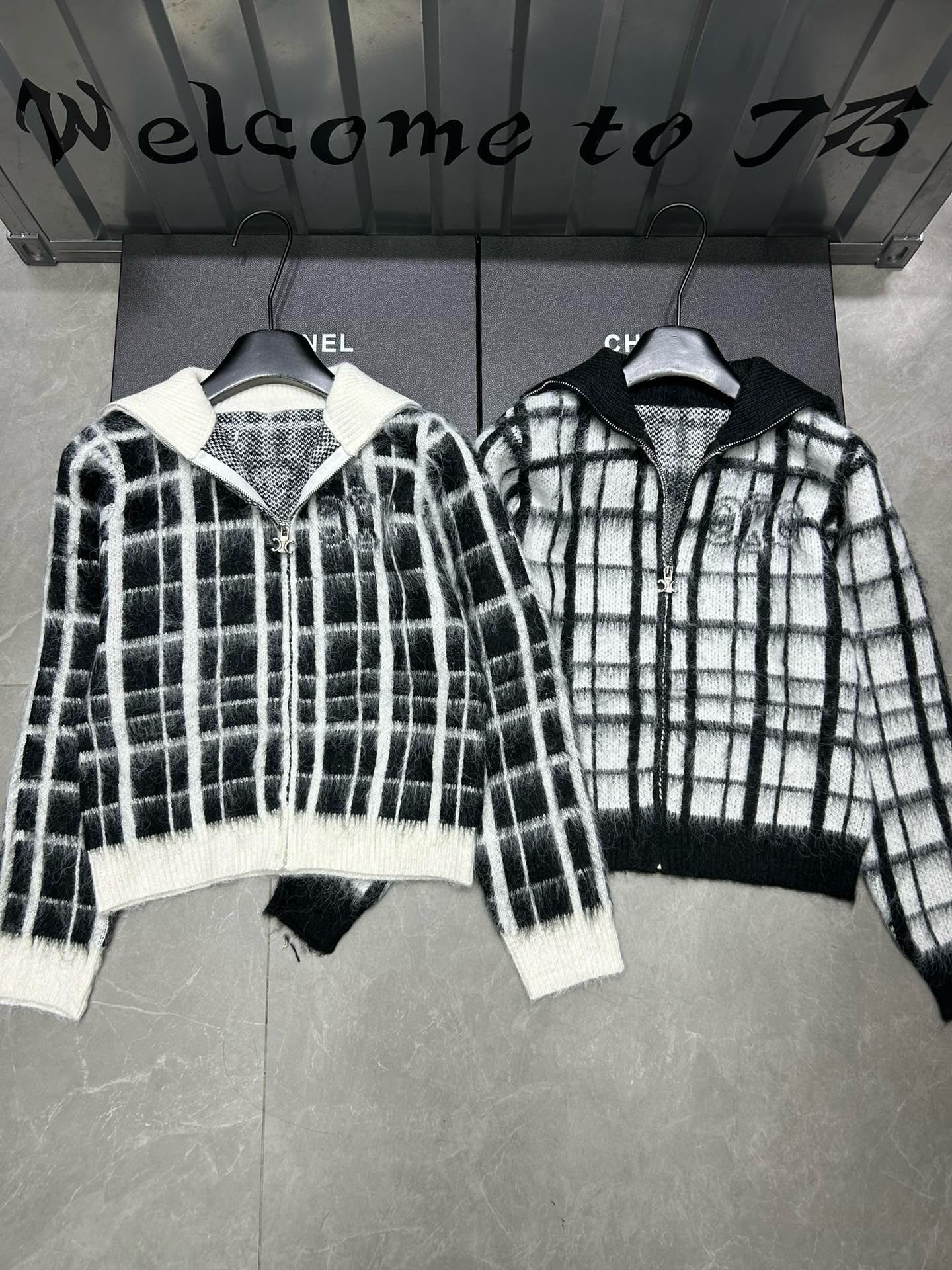 Be the first to review “Celine front and back Arc de Triomphe jacquard plaid mohair lapel long-sleeved zipper knitted sweater cardigan jacket”