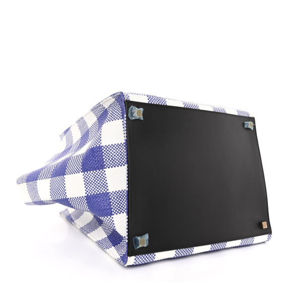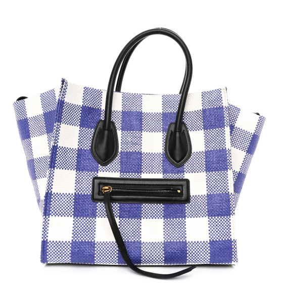 This is an authentic CELINE Gingham Woven Medium Phantom Luggage in Cobalt. This stylish handbag a signature style with wide, expandable wings. The bag features comfortable rolled leather top handles, a curved piping detail and a braided tassel zipper pull. The top is open to a spacious black leather interior with a zipper pocket.