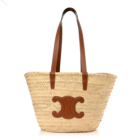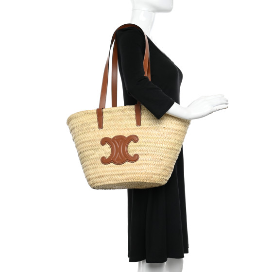 This is an authentic CELINE Raffia Calfskin Triomphe Medium Panier in Tan. This tote is crafted of a light brown woven raffia canvas. It features a brown leather shoulder strap and leather logo patch. The open top leads to an unlined matching woven raffia interior.
