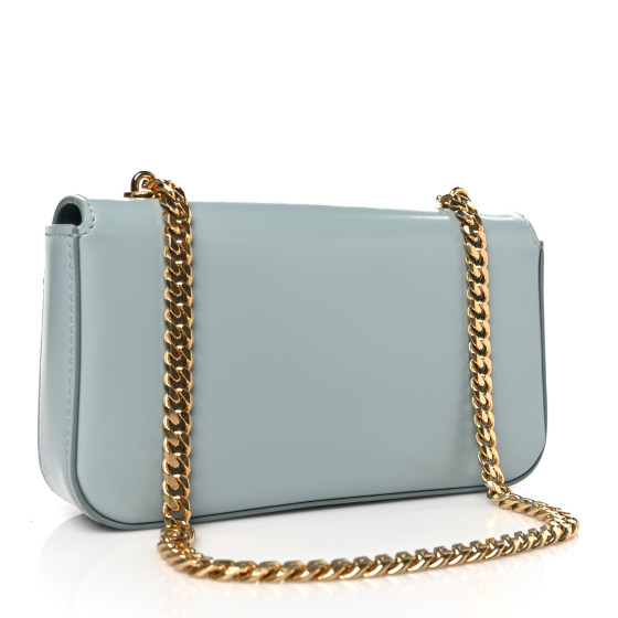 This is an authentic CELINE Shiny Calfskin Triomphe Chain Shoulder Bag in Ice Blue. This chic shoulder bag is crafted of smooth calfskin leather in blue. The bag features a gold chain strap, and a blue Triomphe snap button closure on the crossover flap that opens to a matching leather interior with a patch pocket.