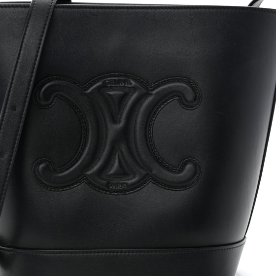This is an authentic CELINE Smooth Calfskin Small Cuir Triomphe Bucket Bag in Black. This ultra chic shoulder bag is crafted of black coated canvas, with black leather trim. The bag features an adjustable leather shoulder strap with gold hardware, and the top is open to a black suede interior.