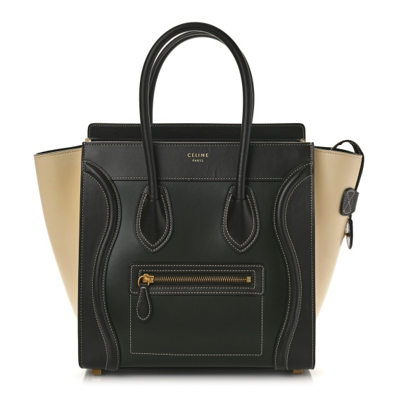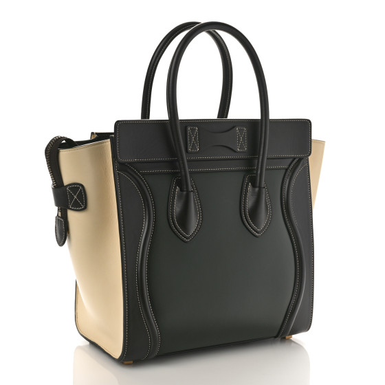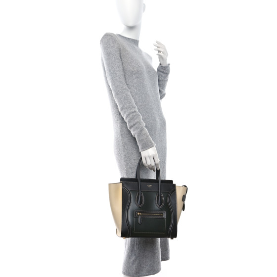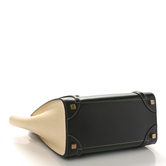 This is an authentic CELINE Smooth Calfskin Tri-Color Micro Luggage in Light Emerald. This popular tote is crafted of smooth calfskin leather with ivory side panels, a green front panel, and black leather trim and rolled top handles. The bag features a front zippered pocket and an overextended top zipper that opens to smooth black leather interior with zipper and patch pockets.