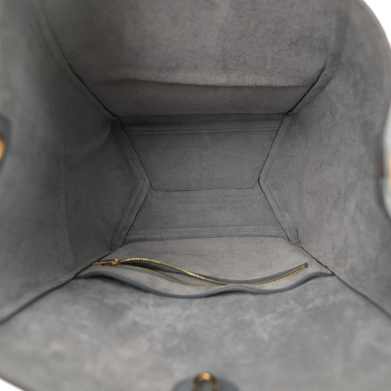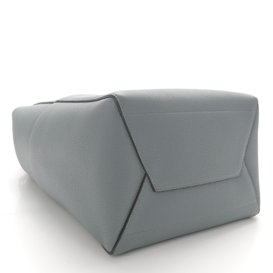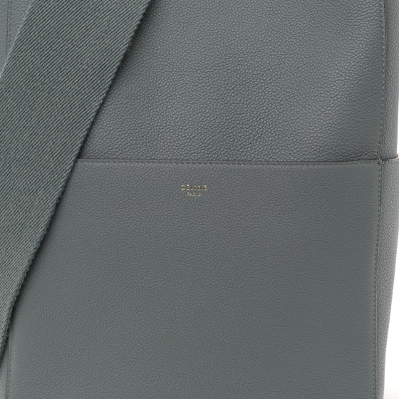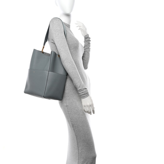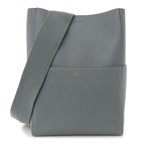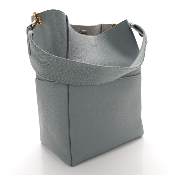 This is an authentic CELINE Soft Grained Calfskin Sangle Bucket Bag in Cloud. This chic shoulder bag is crafted of richly grained calfskin leather in grey. This stylish bag features a canvas shoulder strap with polished gold clasps and a horizontal rim around the center of the bag to form a patch pocket on each side of the bag. The top is open to a matching suede leather interior with zipper and patch pockets.