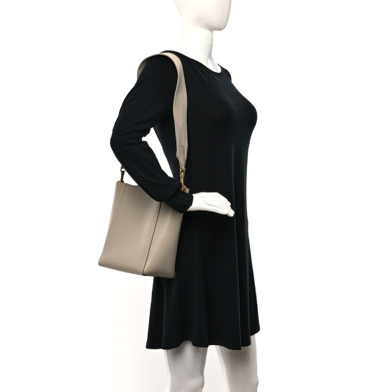 This is an authentic CELINE Soft Grained Calfskin Small Sangle Bucket Bag in Taupe. This ultra-chic shoulder bag is crafted of richly grained calfskin leather in beige. This shoulder bag features a canvas shoulder strap with aged gold clasps. The top opens to a matching suede interior with zipper and patch pockets.