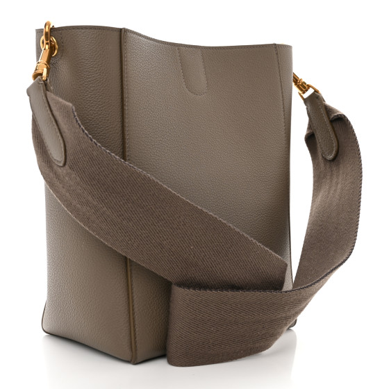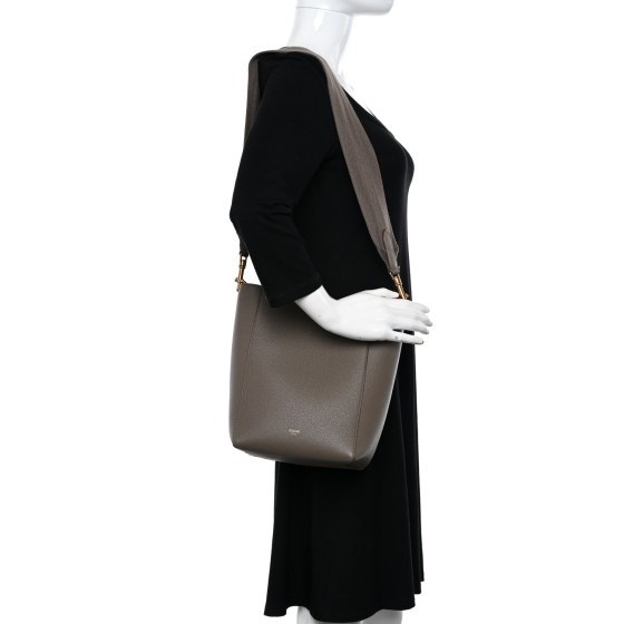 This is an authentic CELINE Soft Grained Calfskin Small Sangle Bucket Bag in Taupe. This chic shoulder bag is crafted of richly grained calfskin leather in taupe. The bag features a canvas shoulder strap with aged gold clasps a hook clasp closure. This opens to a matching suede interior with zipper and patch pockets.