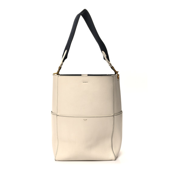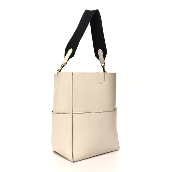 This is an authentic CELINE Supersoft Calfskin Sangle Bucket Bag in White. This ultra chic shoulder bag is crafted of richly soft calfskin leather in white. The bag features a canvas shoulder strap with aged gold clasps and a horizontal rim around the center of the bag to form a patch pocket on each side of the bag. The top is open to a black leather interior.
