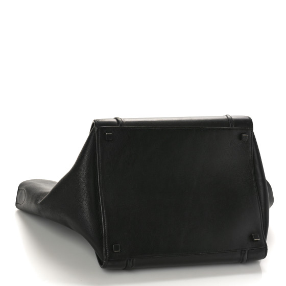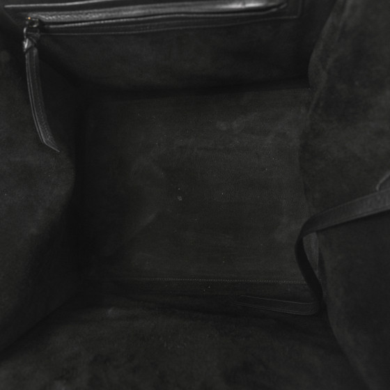This is an authentic CELINE Supple Calfskin Medium Phantom Luggage in Black. This stylish tote is crafted of richly textured calfskin leather in black. The bag features rolled leather top handles, side extended wings, black glazing trim, a facing zipper pocket, and black hardware. The top opens to a spacious black suede interior with a zipper pocket and can be secured with a strap closure.