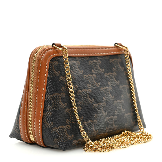 This is an authentic CELINE Triomphe Canvas Calfskin Mini Clutch on Chain in Tan. This sleek tote is beautifully crafted of coated canvas with golden brown lambskin leather trim and a gold chain link shoulder strap. The top zipper opens to a light brown fabric interior.