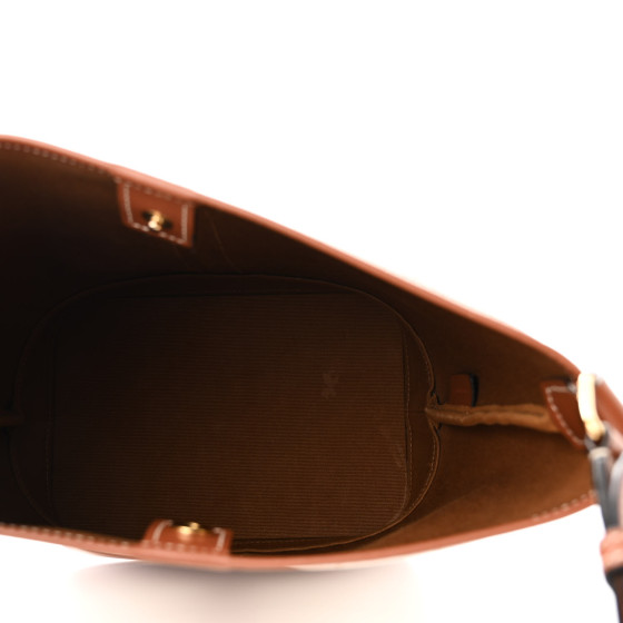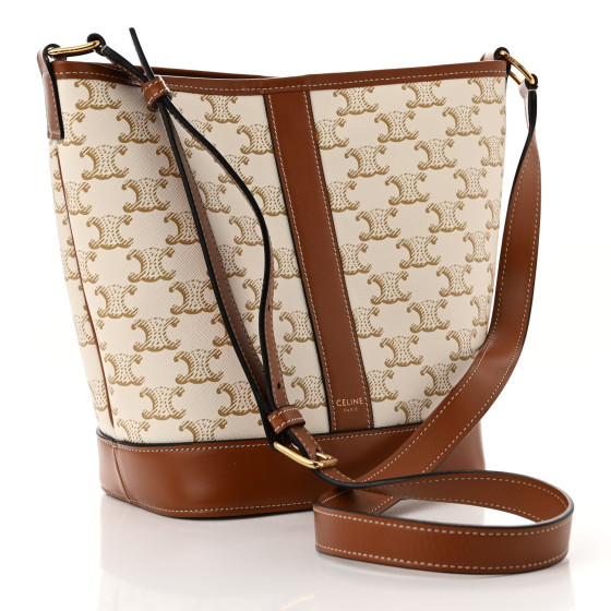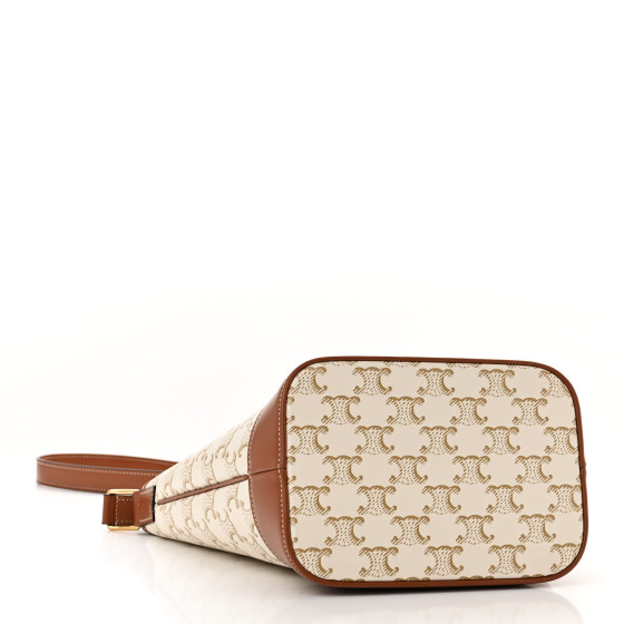 This is an authentic CELINE Triomphe Canvas Calfskin Small Bucket Bag in White. This ultra-chic shoulder bag is crafted of white Triomphe monogram coated canvas with brown leather trim. The bag features an adjustable leather shoulder strap with gold hardware and a snap closure. The top opens to a brown fabric interior.