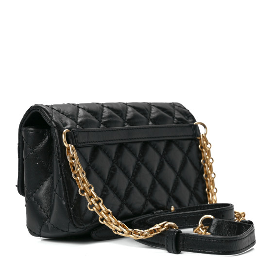 This is an CHANEL Aged Calfskin Quilted 2.55 Reissue Flap Belt Bag Clutch in Black. This stylish waist bag is finely crafted of diamond quilted black calfskin. The bag features a leather belt strap waist strap with adjustment holes. This opens to a black calfskin interior with a patch pocket.
