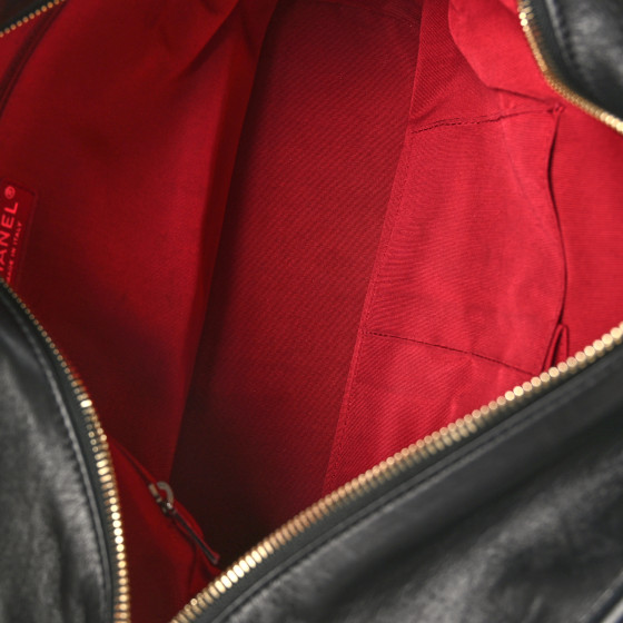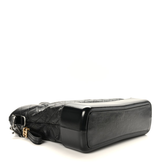 This is an CHANEL Aged Calfskin Quilted Large Gabrielle Shopping Tote in Black. This chic hobo is crafted of textured aged and smooth calfskin diamond stitched leather in black. The bag features a smooth leather base, gradient gold to ruthenium chain threaded leather shoulder strap, and black leather zipper pull. The top zipper pull opens to a spacious red fabric interior with patch and zipper pockets.