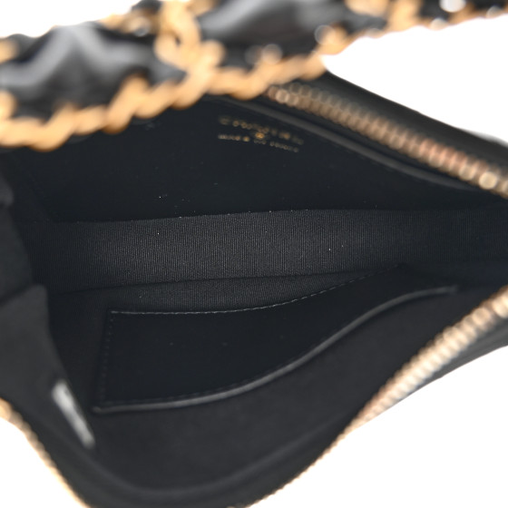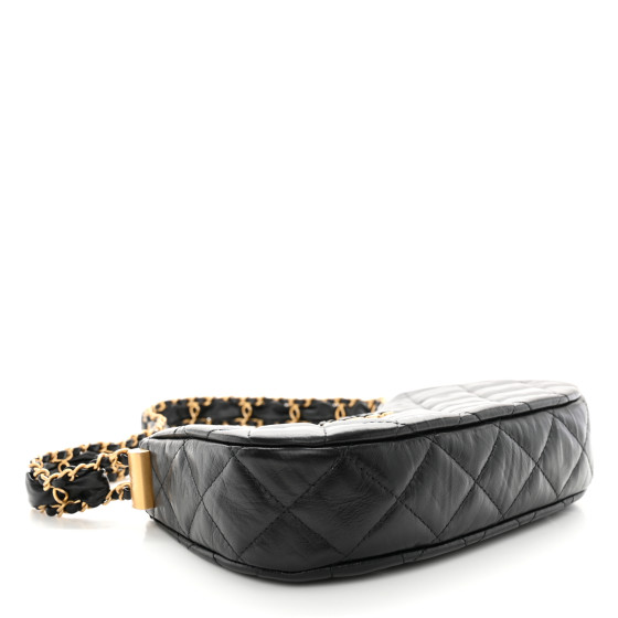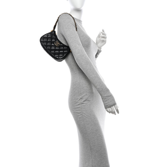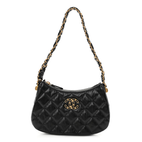 This is an CHANEL Aged Calfskin Quilted Small Chanel 19 Hobo in Black. This stylish shoulder bag is crafted of diamond-quilted calfskin leather in black. The refined bag features a Chanel CC embellishment on the front and a leather threaded aged gold chain-link shoulder strap. The front flap opens to a black fabric and leather interior with patch pockets.