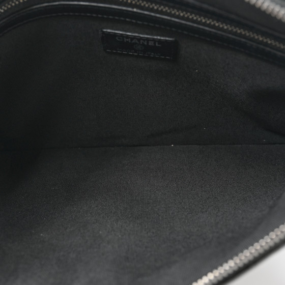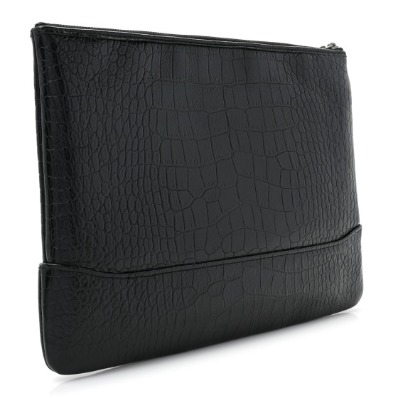This is an CHANEL Crocodile Embossed Calfskin Quilted Medium Gabrielle Cosmetic Case in Black. This stylish case is crafted of luxurious crocodile embossed quilted calfskin leather in black. The bag features a leather wristlet with the Chanel logo in gold and a leather zipper pull with an aged gold Chanel CC that opens to a black fabric interior.