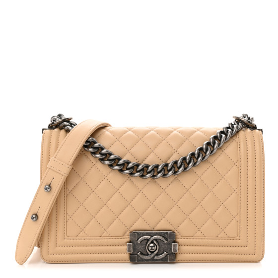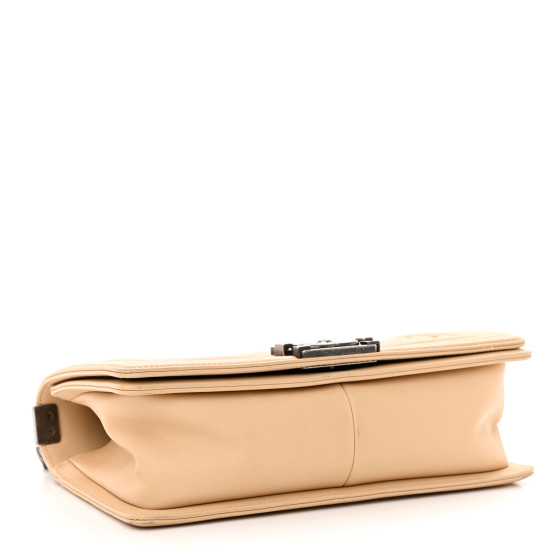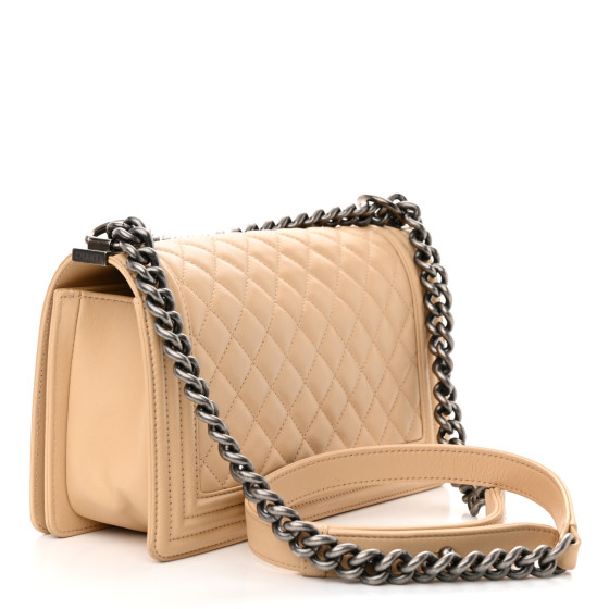 This is an CHANEL Calfskin Quilted Medium Boy Flap in Beige. This stylish shoulder bag is crafted of beautiful diamond quilted calfskin leather in beige. The bag features a ruthenium chain shoulder strap with a leather shoulder pad and a full front flap with linear quilted borders and a ruthenium Chanel CC Boy press lock. This opens to a matching fabric interior with a flat pocket.