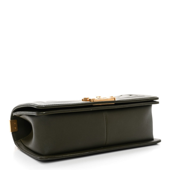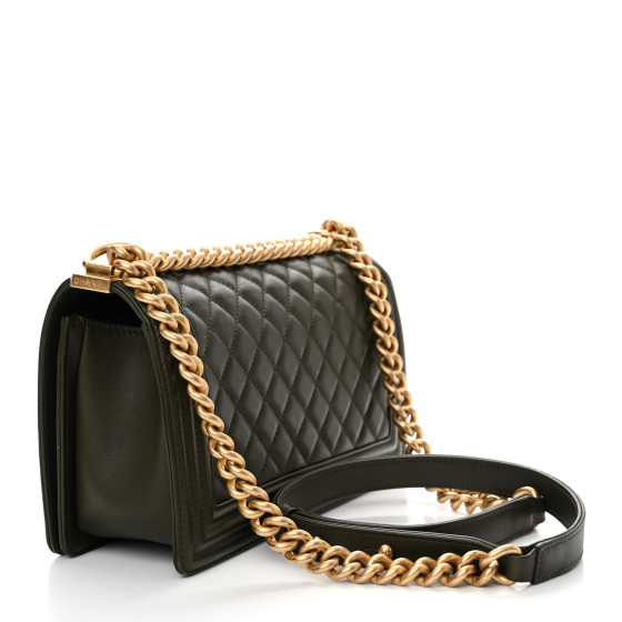 This is an CHANEL Calfskin Quilted Medium Boy Flap in Khaki. This stylish shoulder bag is crafted of luxuriously textured diamond quilted calfskin leather framed by peripheral linear quilting. The bag features an aged gold chain strap with a leather shoulder pad, and an aged gold Chanel Boy CC press lock for the facing flap. This opens to a green leather interior with a patch pocket.