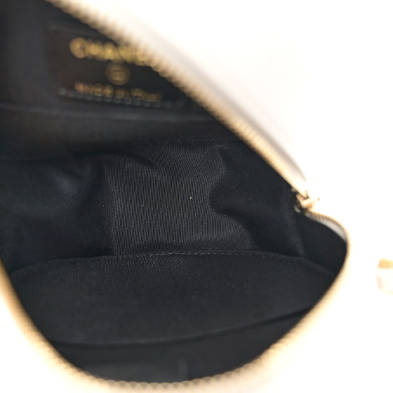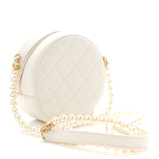 This is an CHANEL Calfskin Quilted Pearl Round Clutch With Chain in White. This stylish cross body bag is crafted of luxurious calfskin leather in white. The bag features a faux pearl shoulder strap with a white leather shoulder pad and an aged gold Chanel CC logo on the front. This shoulder bag opens with a top zipper to a black fabric interior.