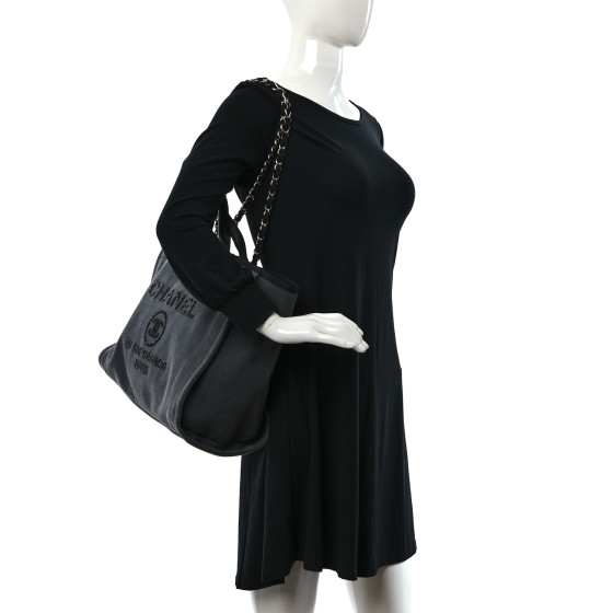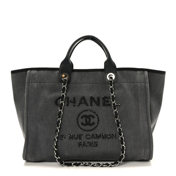 CHANEL Canvas Sequin Medium Deauville Tote in Charcoal. This stylish tote is crafted of fine denim in grey, with a dark grey sequined Chanel 31 Rue Cambon Paris logo on the front. The shoulder bag features black rolled leather top handles and grosgrain fabric threaded silver chain shoulder straps. The top is open to a spacious black fabric interior with zipper and patch pockets.