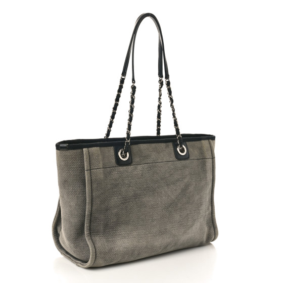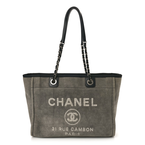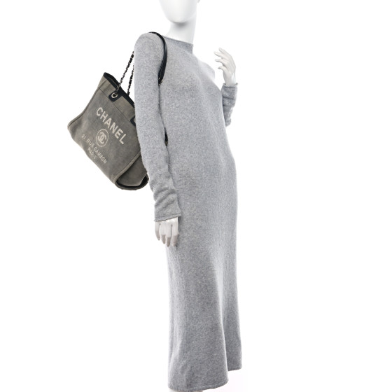 CHANEL Canvas Small Deauville Tote in Grey. This tote is crafted of grey canvas, with a white Chanel advertisement logo on the front. The bag features silver chain-link fabric threaded straps with leather shoulder pads. The wide top is open to a black fabric interior with zipper and patch pockets.