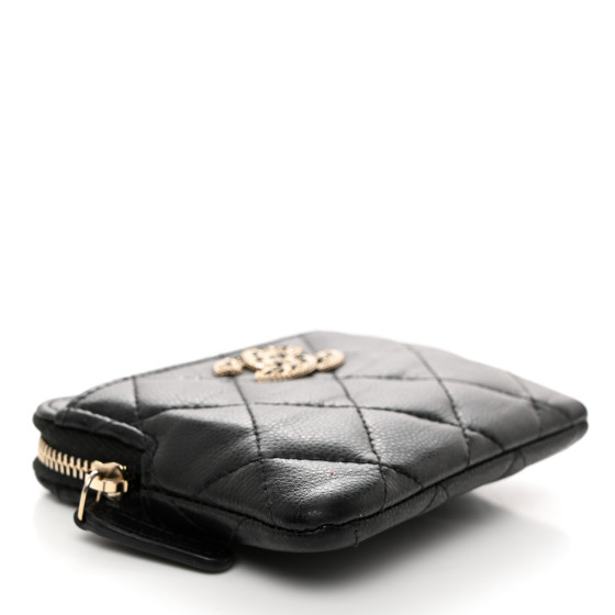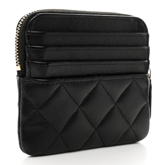 This is an CHANEL Caviar Quilted Crystal Zip Card Holder Wallet in Black. This card holder is crafted of diamond quilted caviar leather in black with a crystal embellished leather threaded gold chain Chanel CC on the front and card slots on the exterior. The top zipper of the main compartment opens to a black fabric interior.
