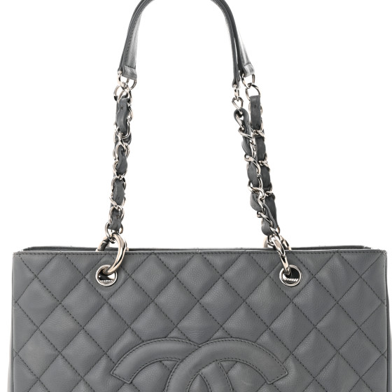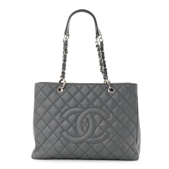 CHANEL Caviar Quilted Grand Shopping Tote GST in Light Grey. This stylish tote is crafted of diamond quilted caviar leather in a light grey. This shoulder bag features leather threaded polished silver chain-link shoulder straps with shoulder pads, a quilted Chanel CC logo on the front and a flat pocket on the rear. The top opens to a partitioned grey fabric interior with zipper and patch pockets.